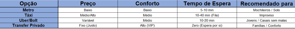 Neste artigo, analisamos honestamente as 4 principais opções (Metro, Táxi, Apps de Transporte e Transfer Privado) para que possa escolher a que melhor se adapta às suas necessidades.